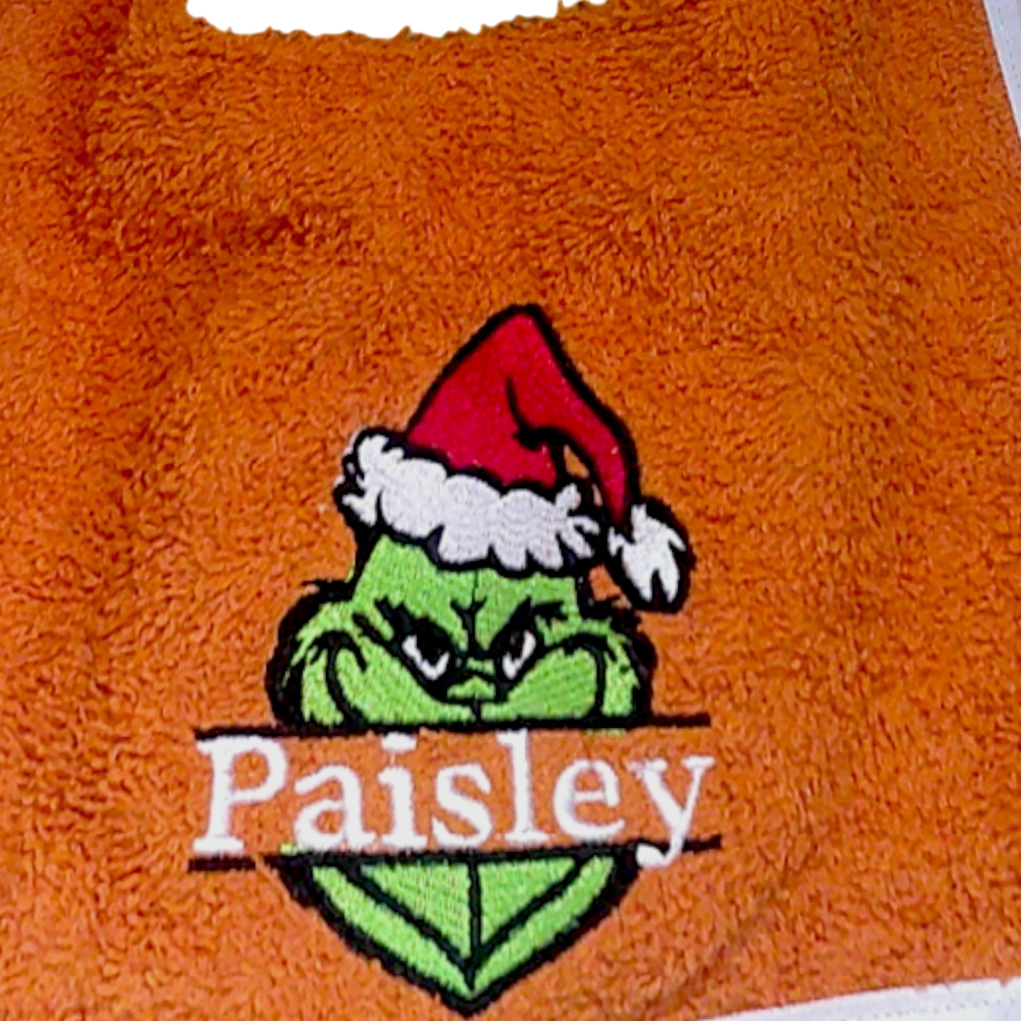 Personalised Christmas Dog Bib – Custom Name Holiday Bib with Embroidered Green Character & Santa Hat | Waterproof Backing & Soft Towelling