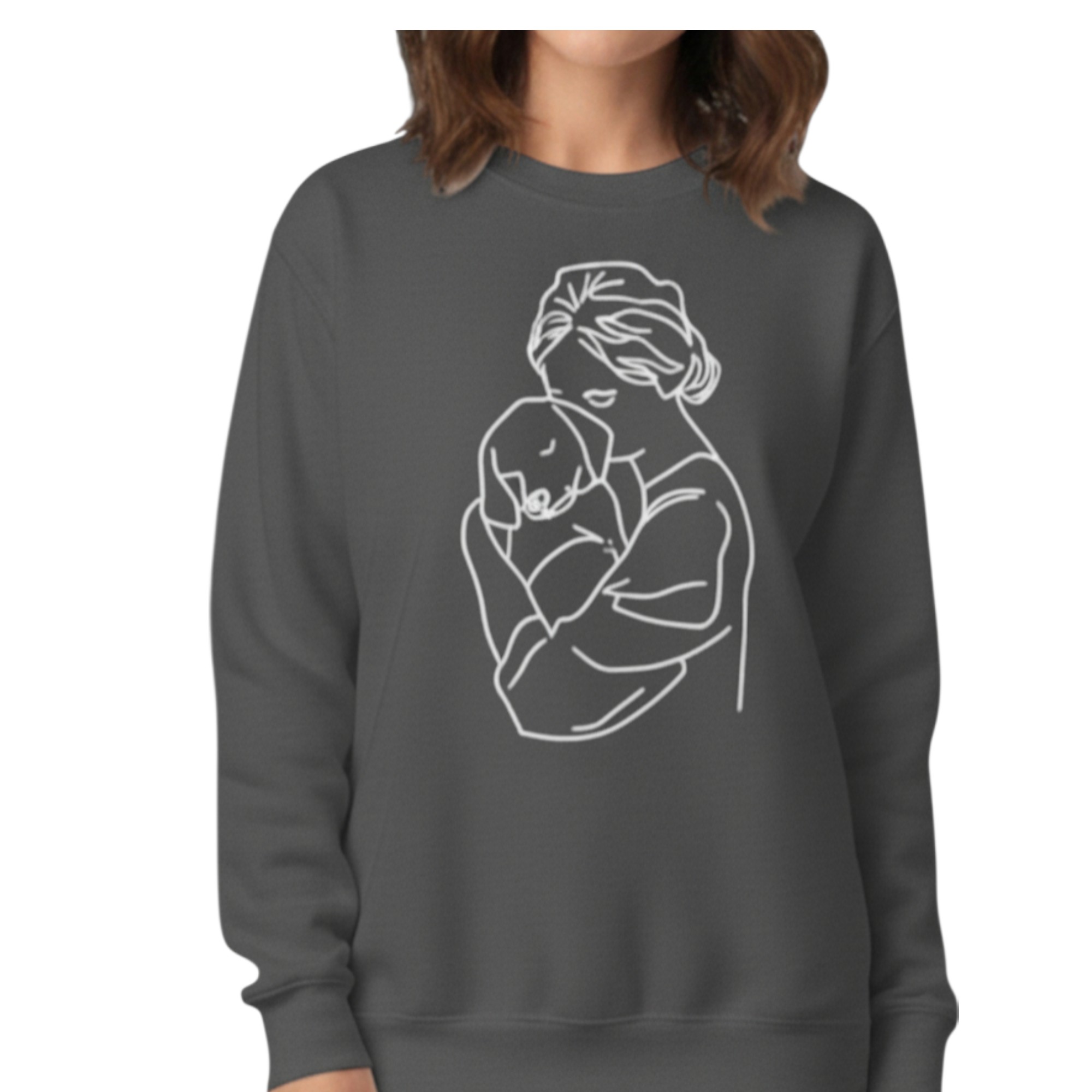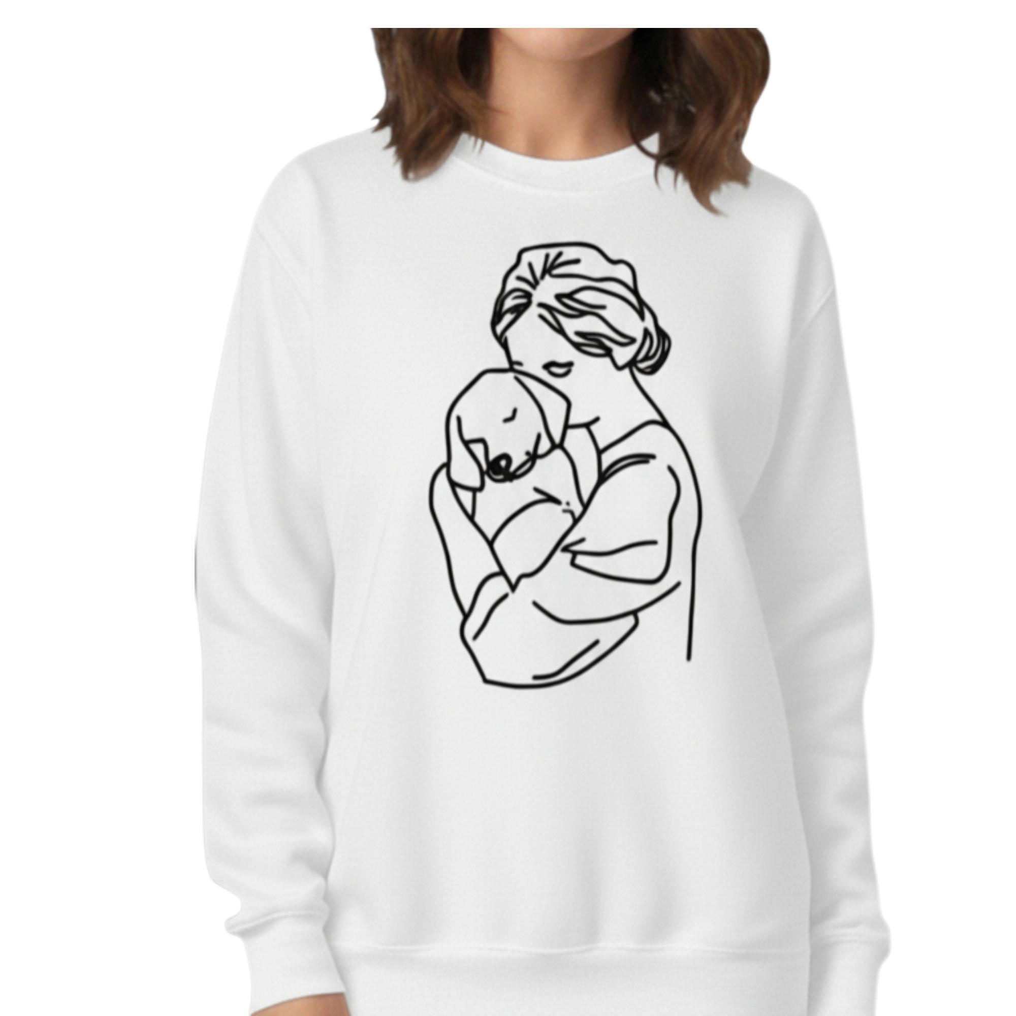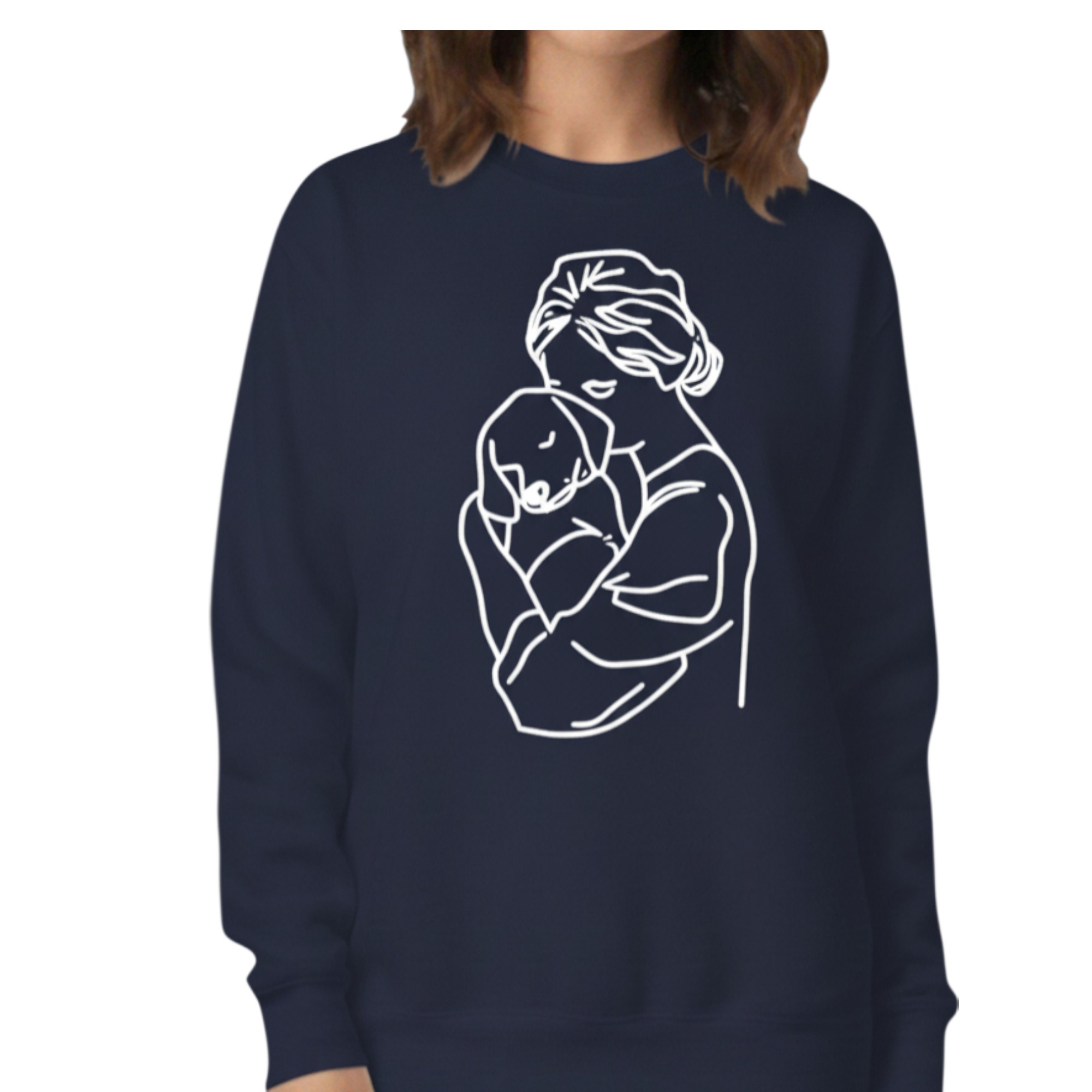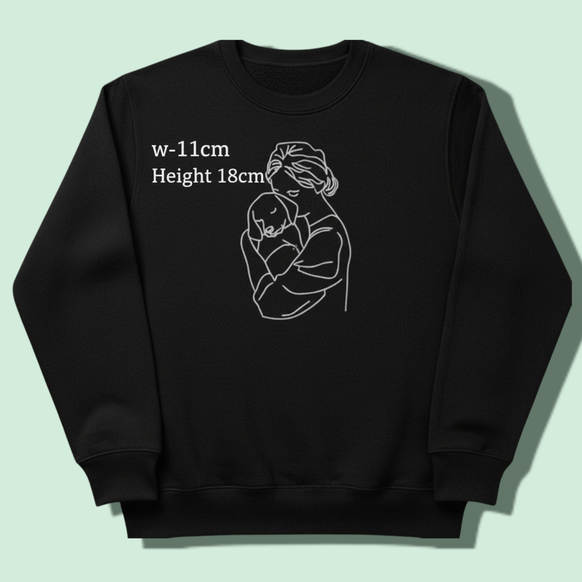 This dog mum sweatshirt personalised design is created for women who adore their dogs. The elegant embroidery shows a woman gently hugging her dog, capturing a moment of comfort, love, and connection.