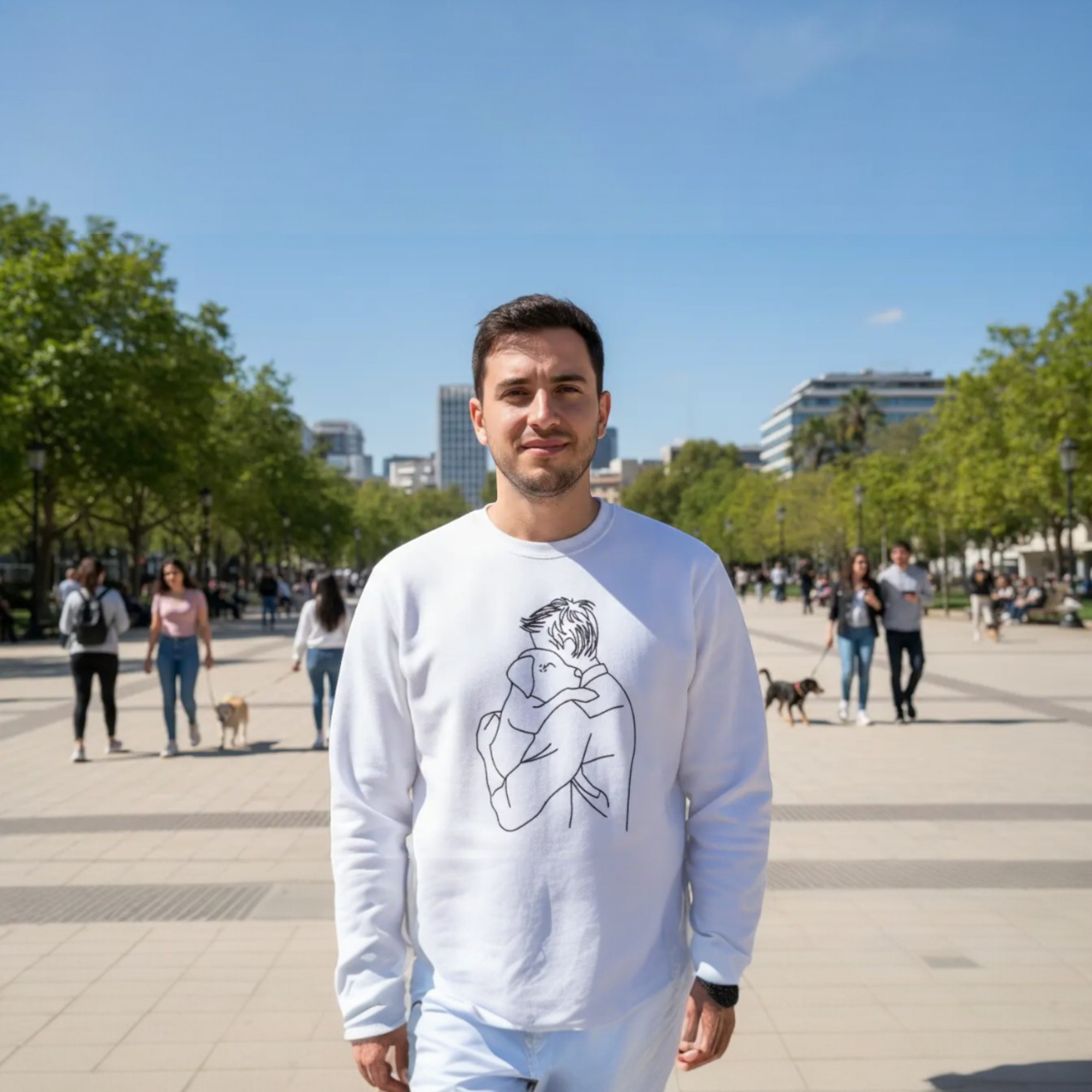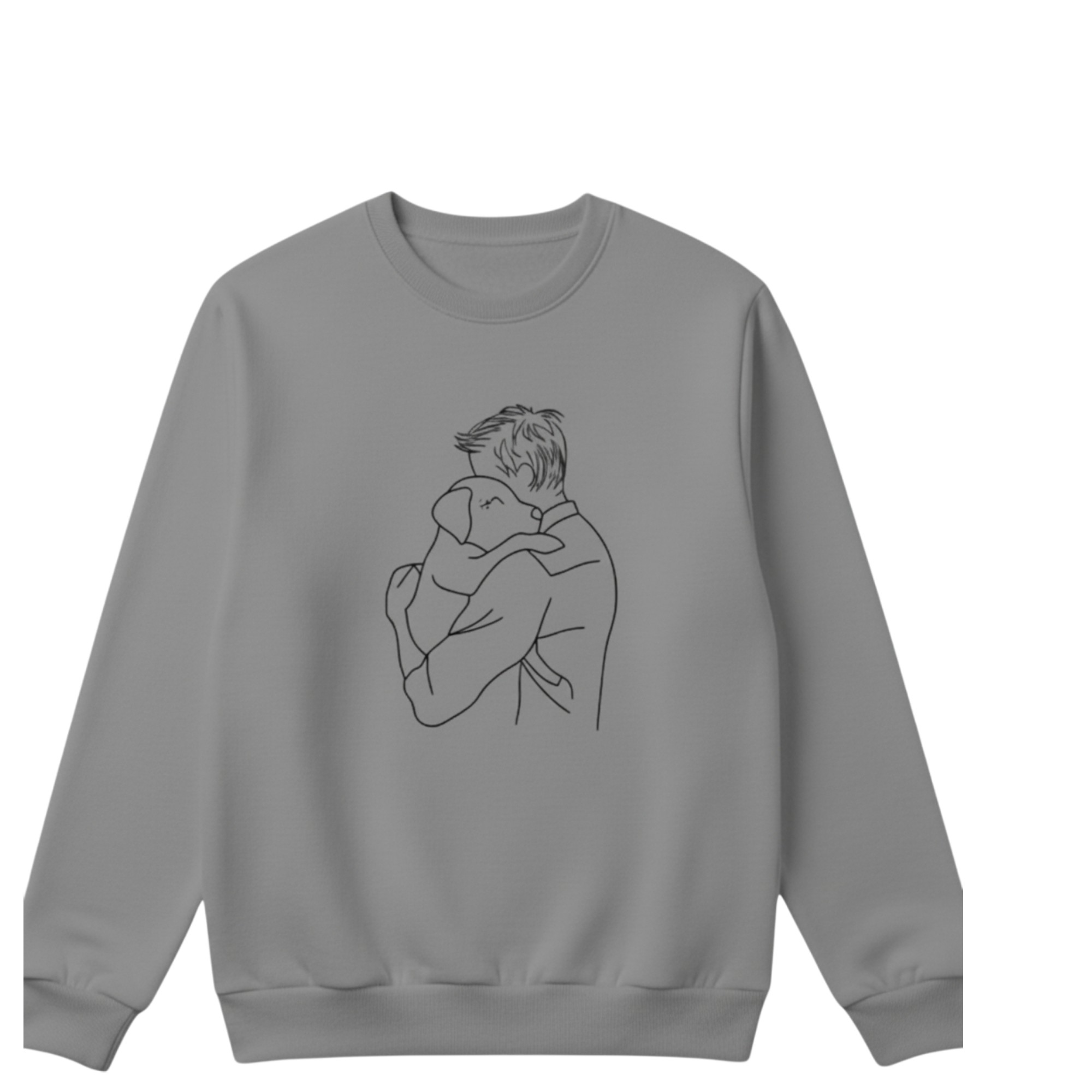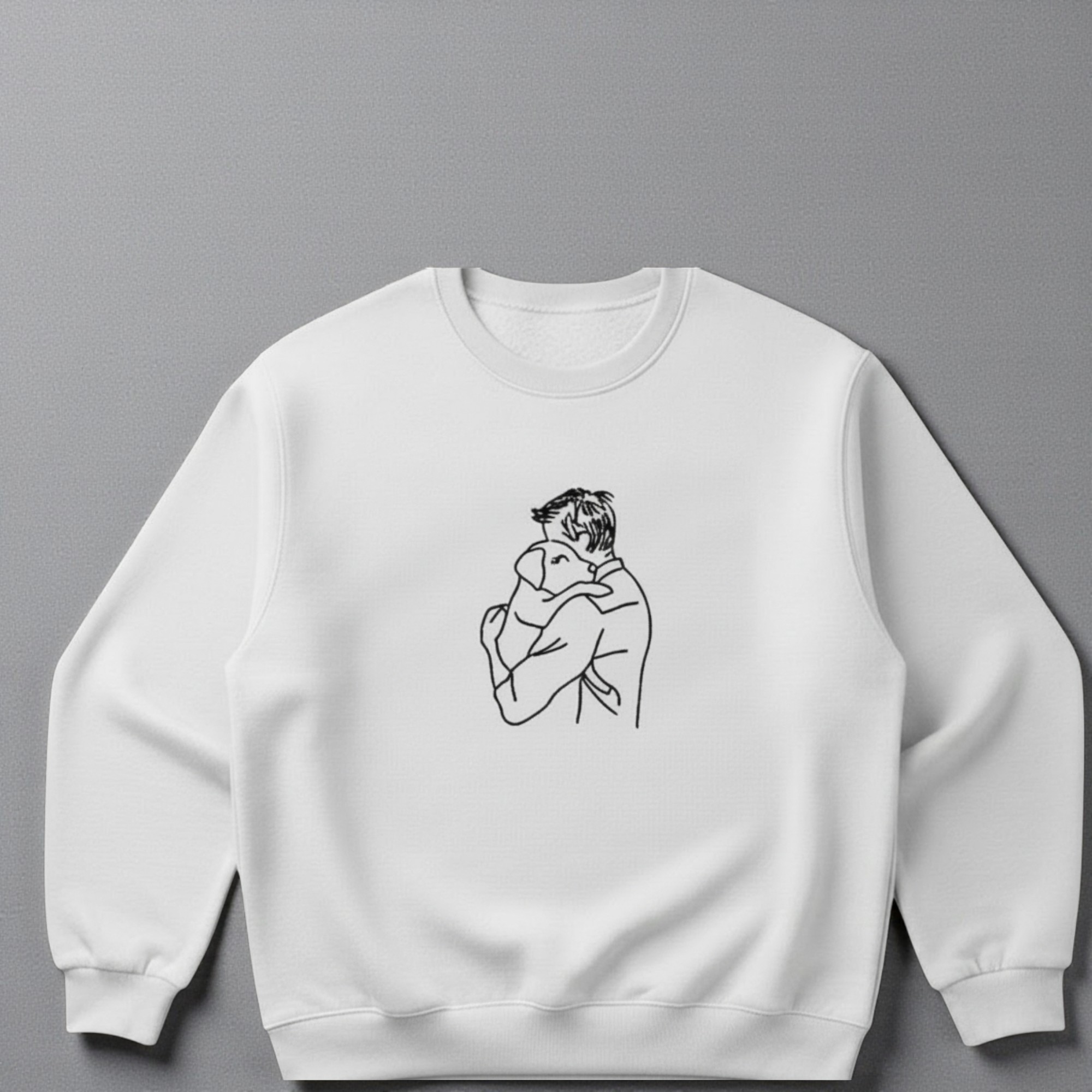 Celebrate the special bond between humans and their dogs with this beautifully crafted personalised dog lover sweatshirt. Featuring a delicate embroidered design of a man hugging his dog, this jumper captures warmth, loyalty, and love in a simple yet powerful way.