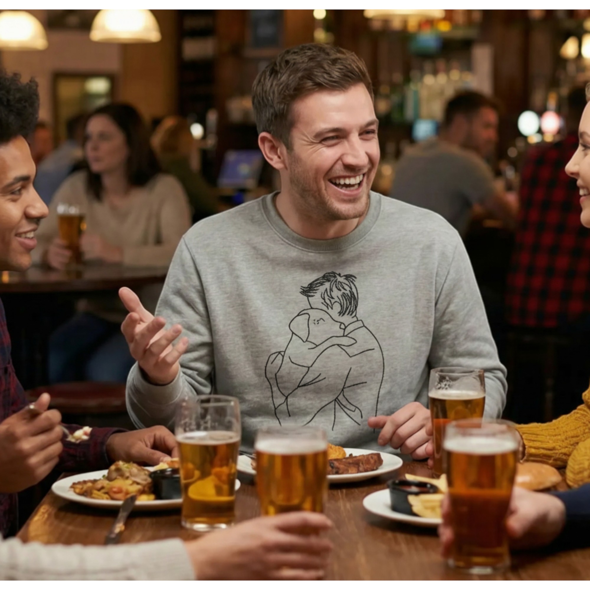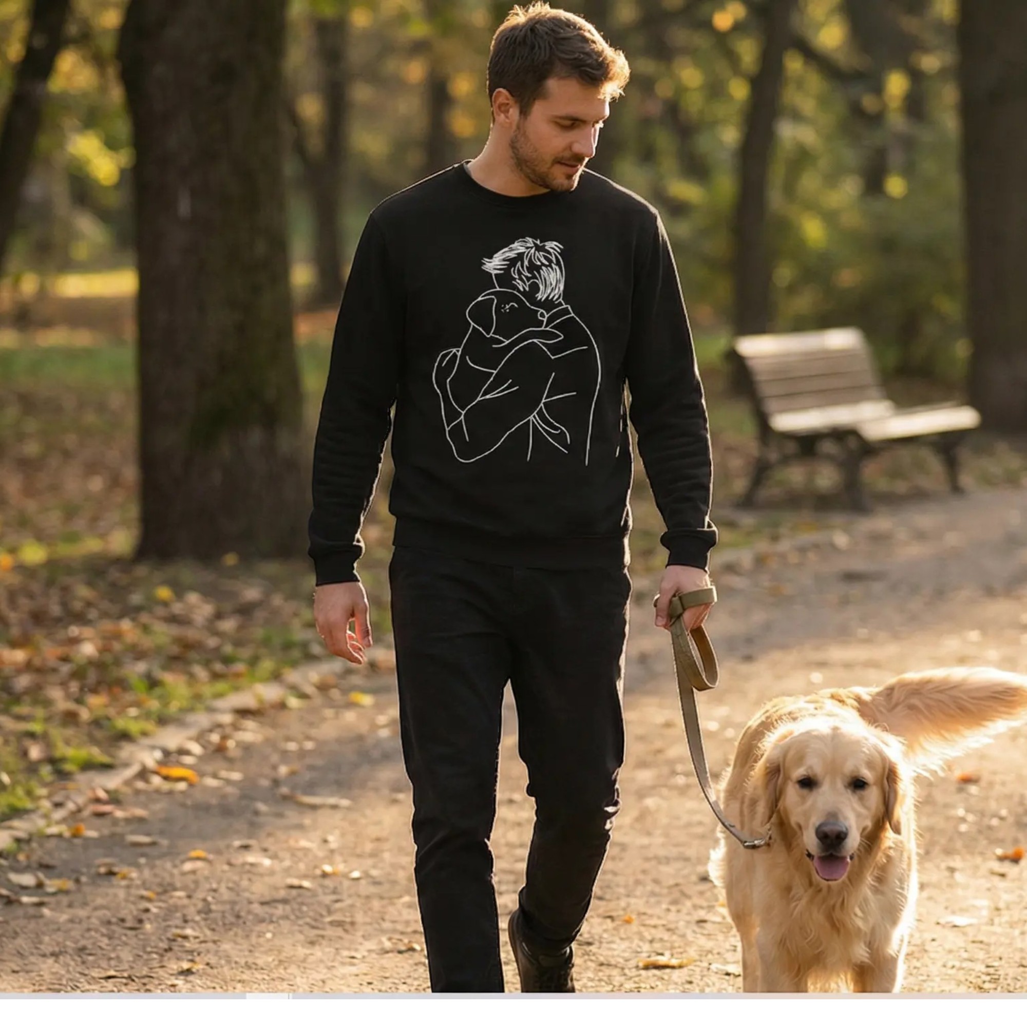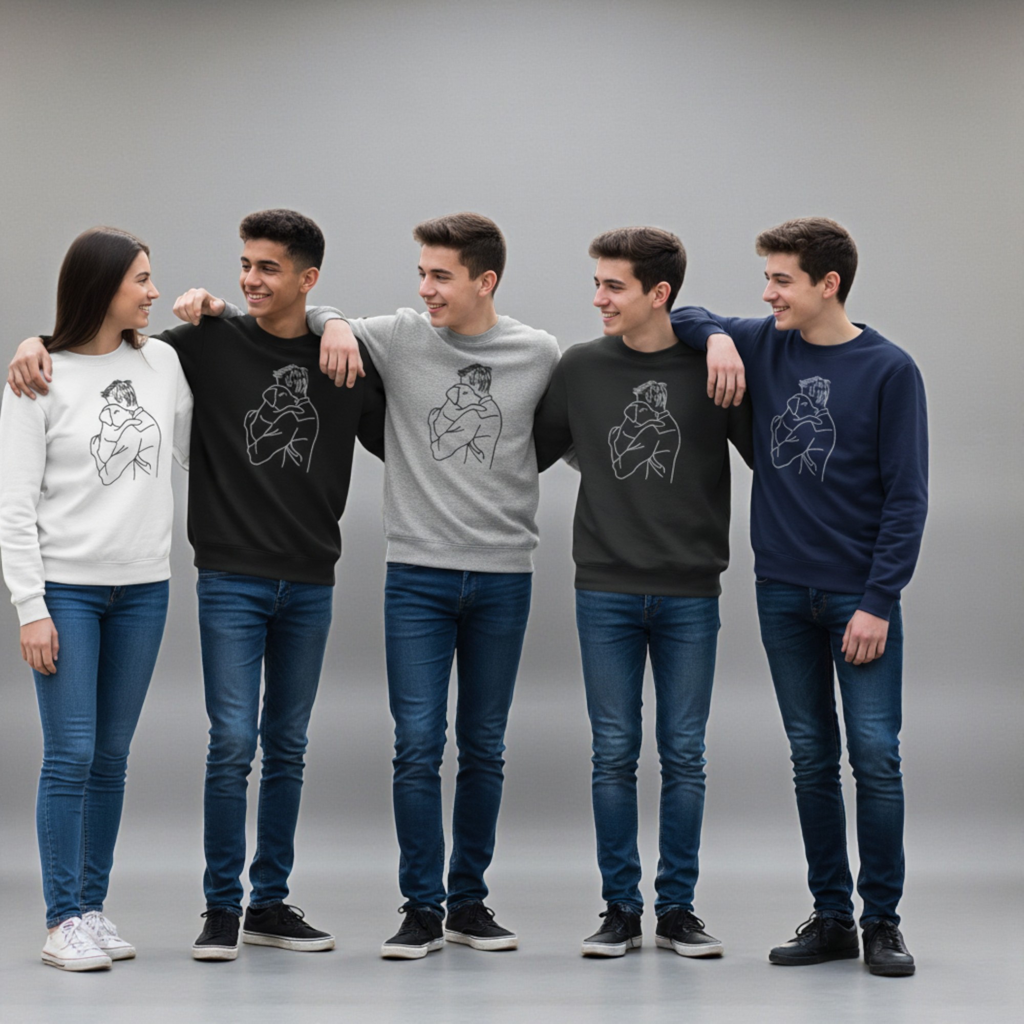 Celebrate the special bond between humans and their dogs with this beautifully crafted personalised dog lover sweatshirt. Featuring a delicate embroidered design of a man hugging his dog, this jumper captures warmth, loyalty, and love in a simple yet powerful way.