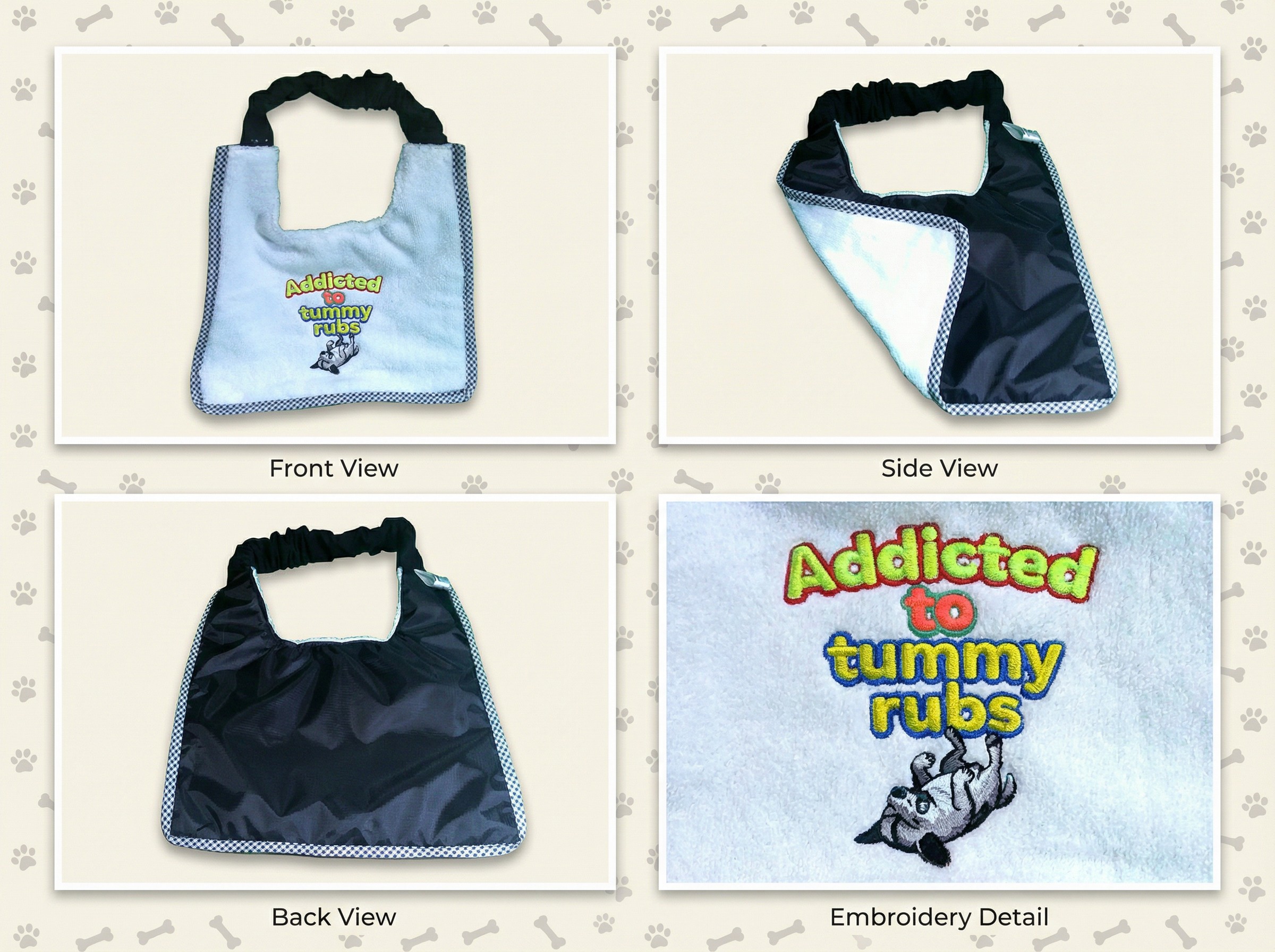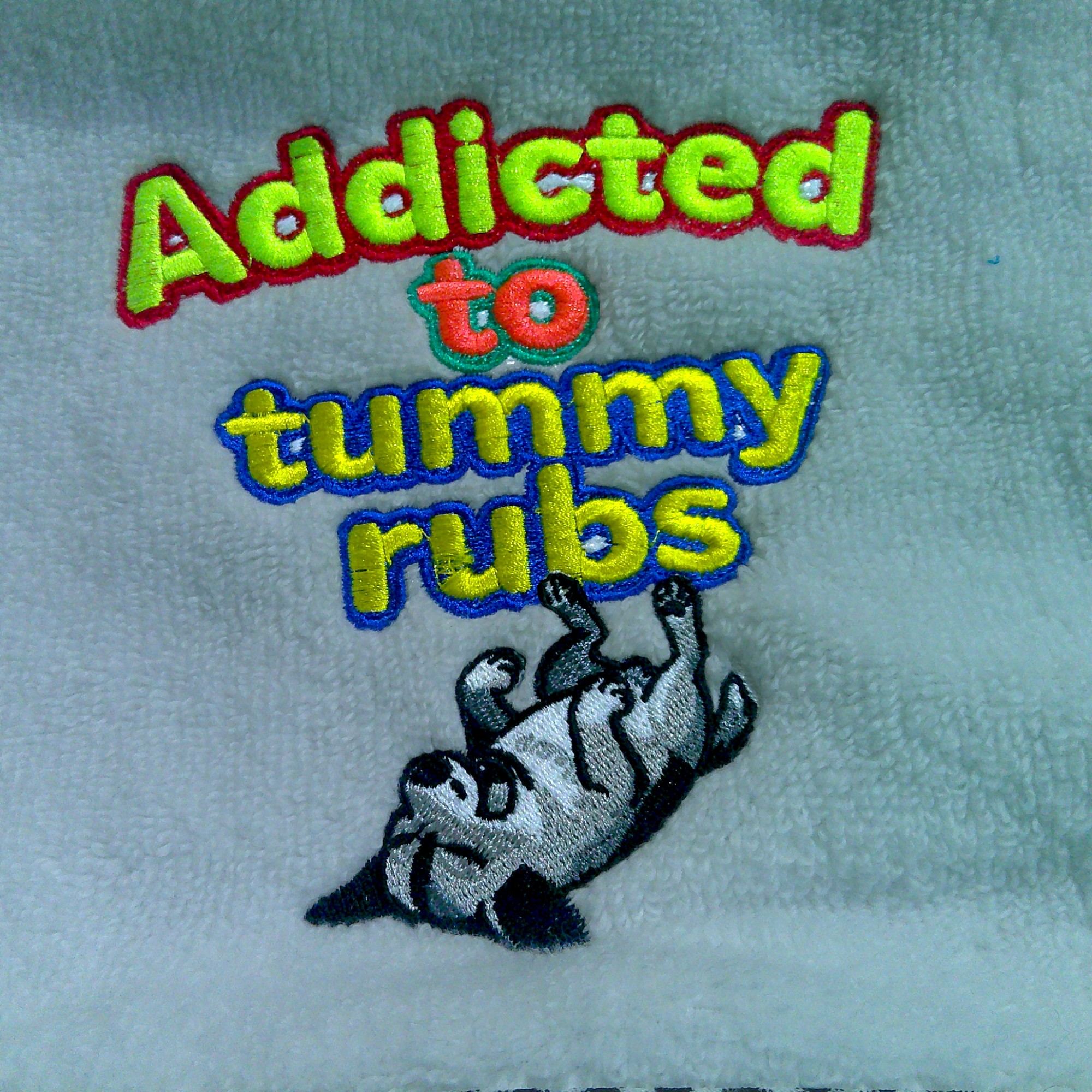 High-quality embroidery – “Addicted to Tummy Rubs” design is included as standard.