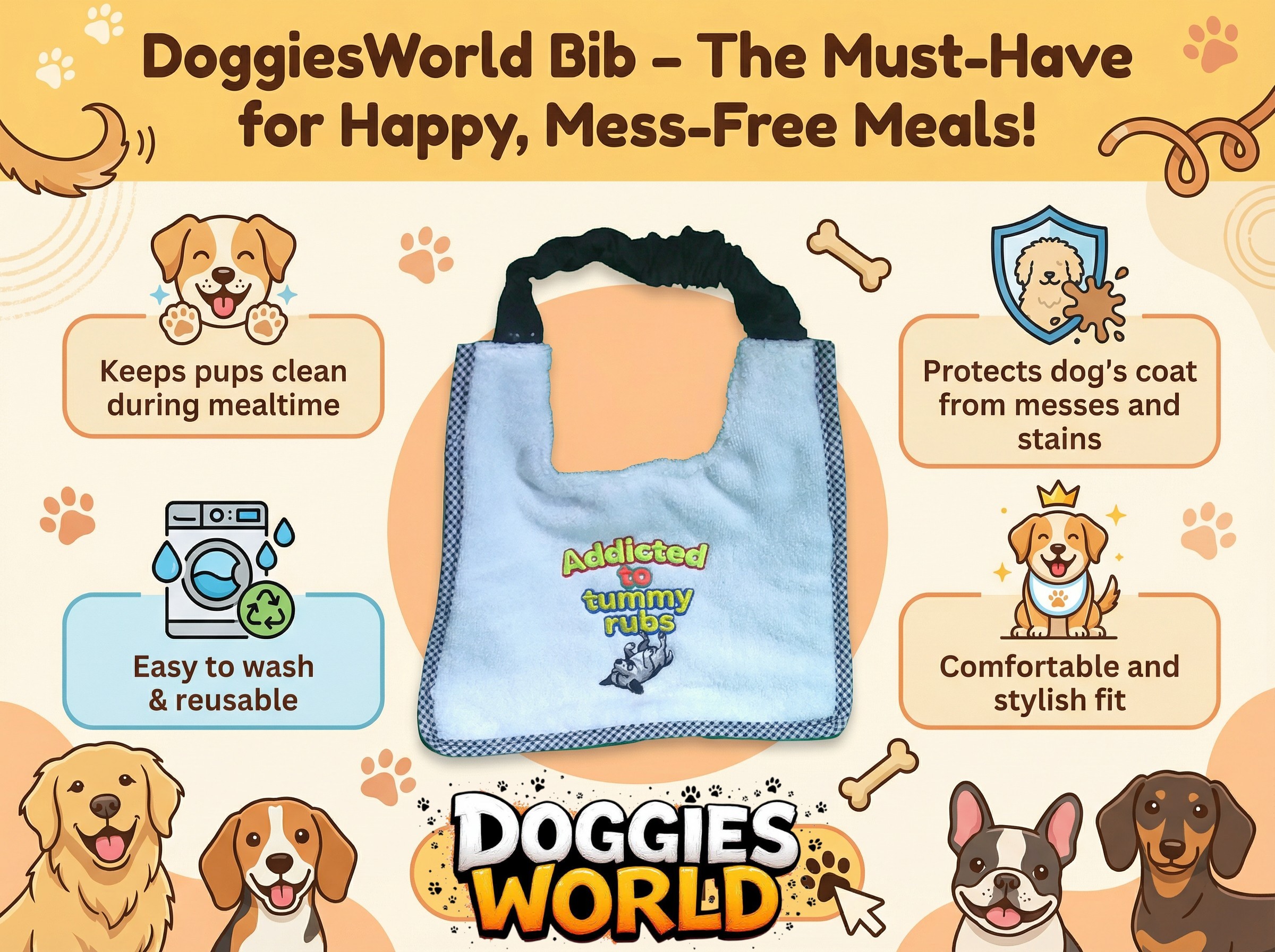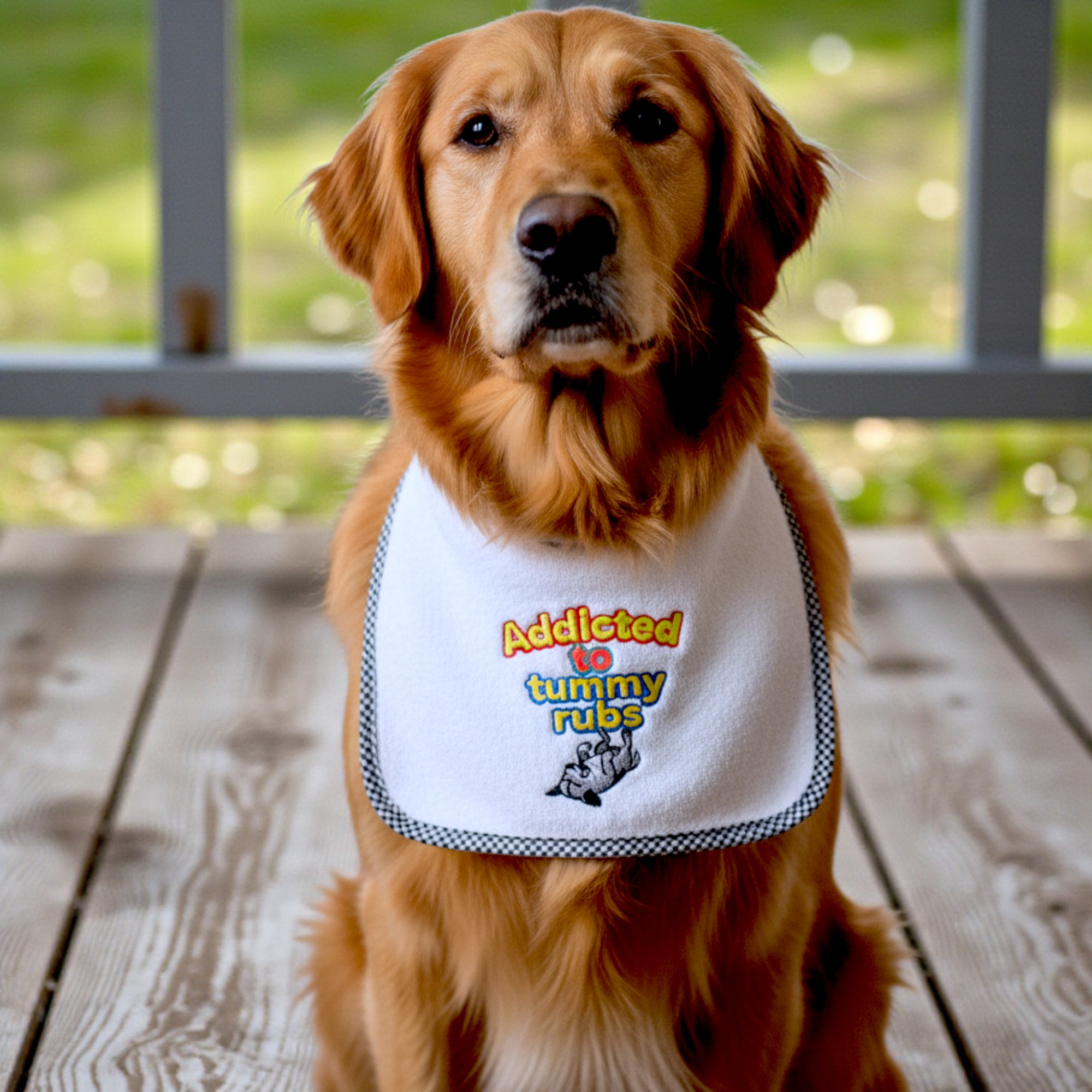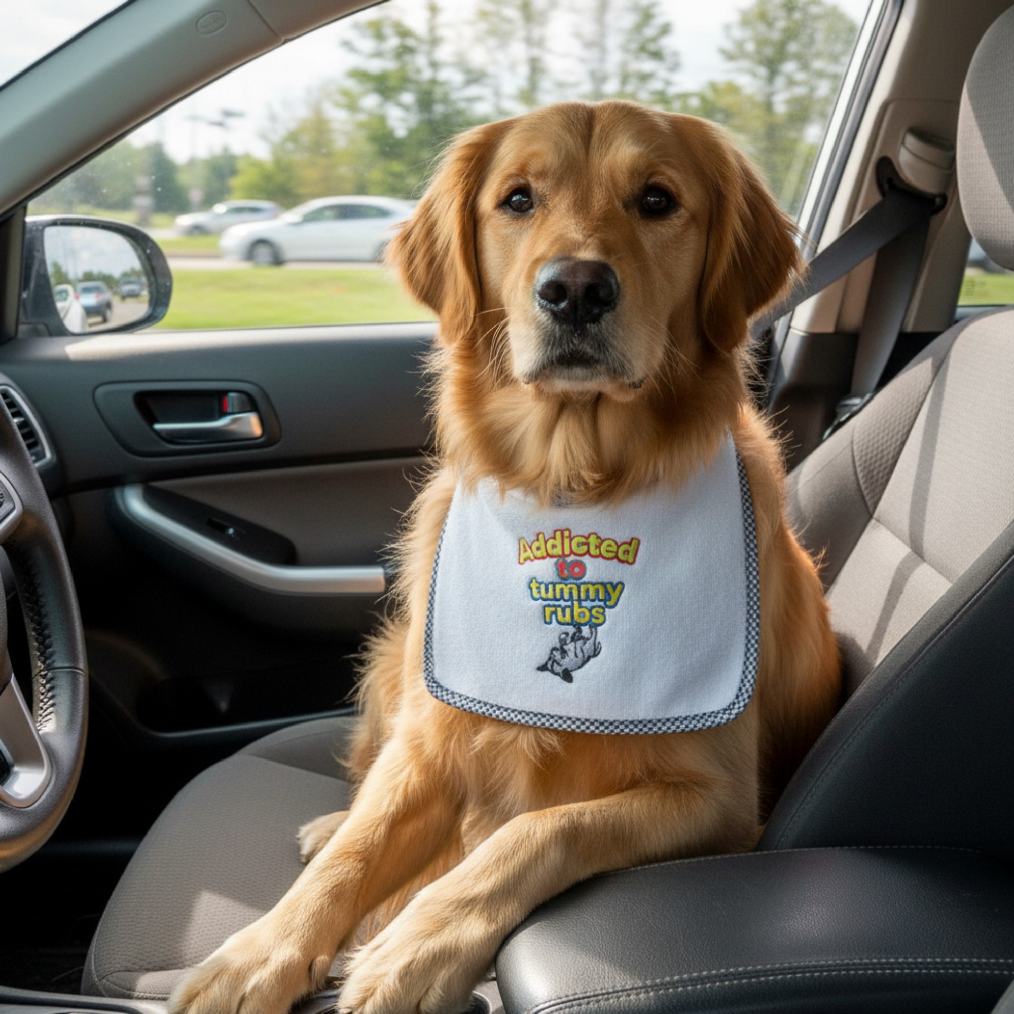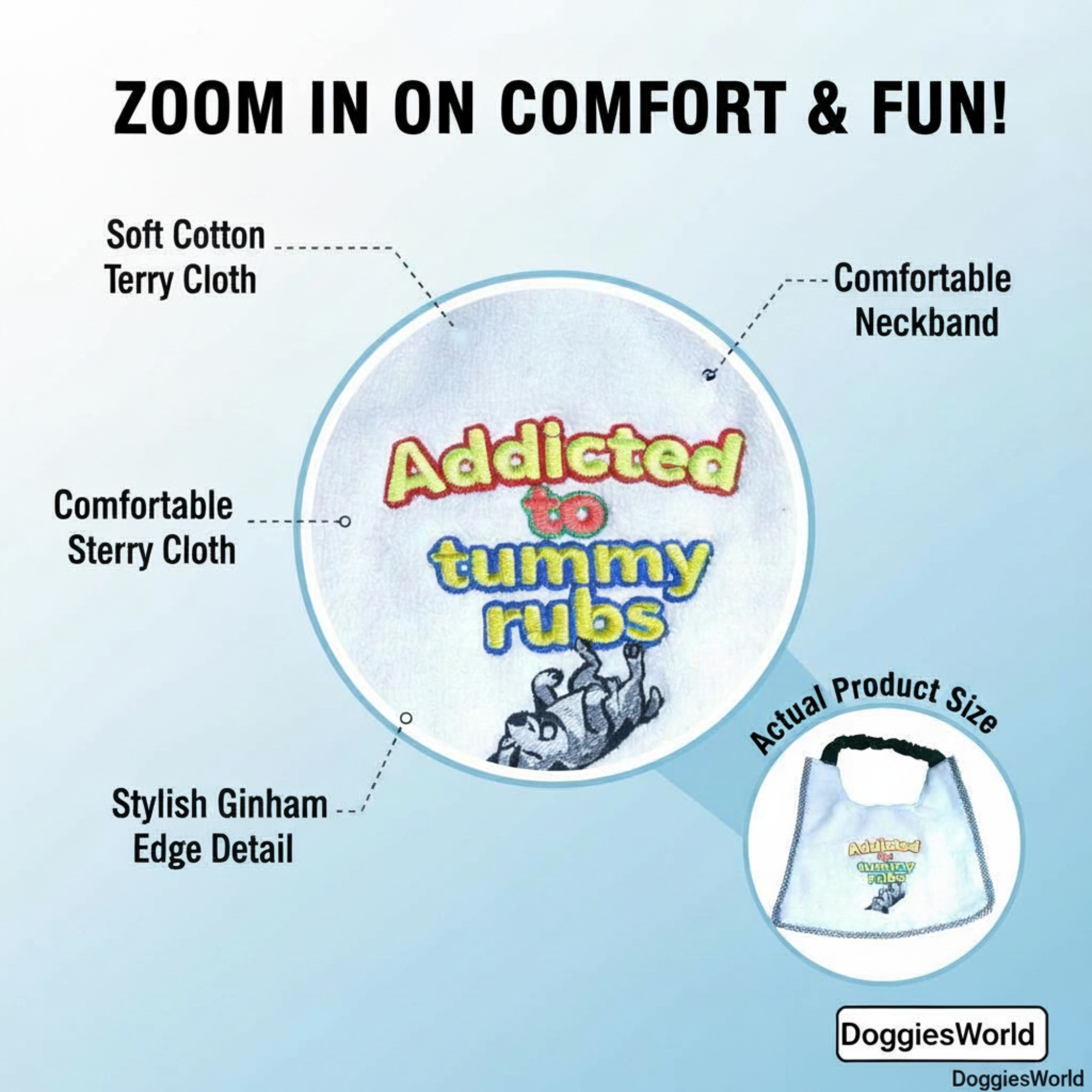 This adorable Addicted to Tummy Rubs Dog Bib is the perfect mix of cute and practical. Designed by DoggiesWorld in the UK, this bib protects your dog’s fur during meals, car rides, and outdoor trips, while adding a fun embroidered message that makes everyone smile. Does your dog love attention and tummy rubs? then this is your chance to spread the news