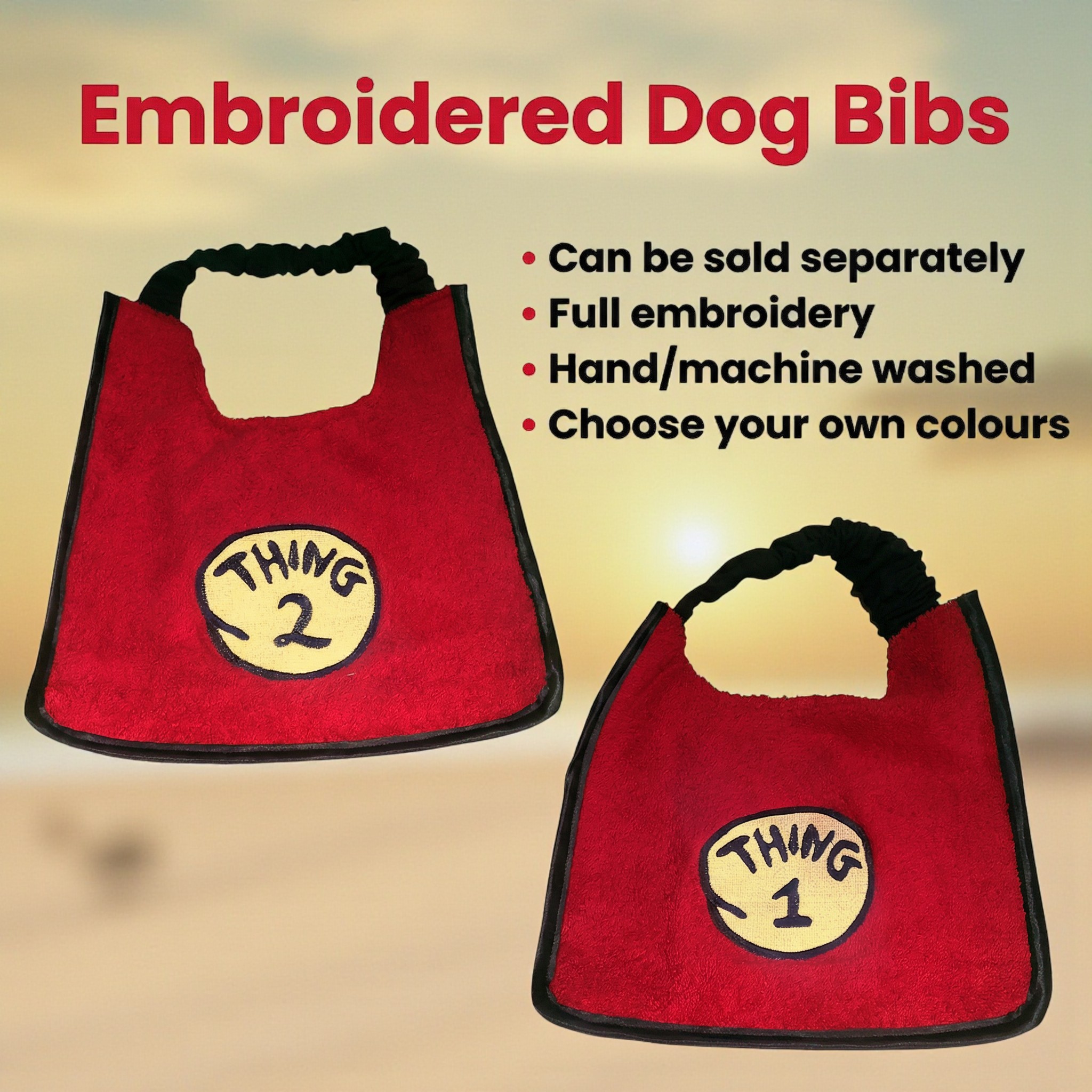Give your dog a bold and playful look with these comic-style embroidered dog bibs. Designed in a rounded cartoon-inspired style, the embroidery features bright colours and strong outlines, just like a classic comic panel.