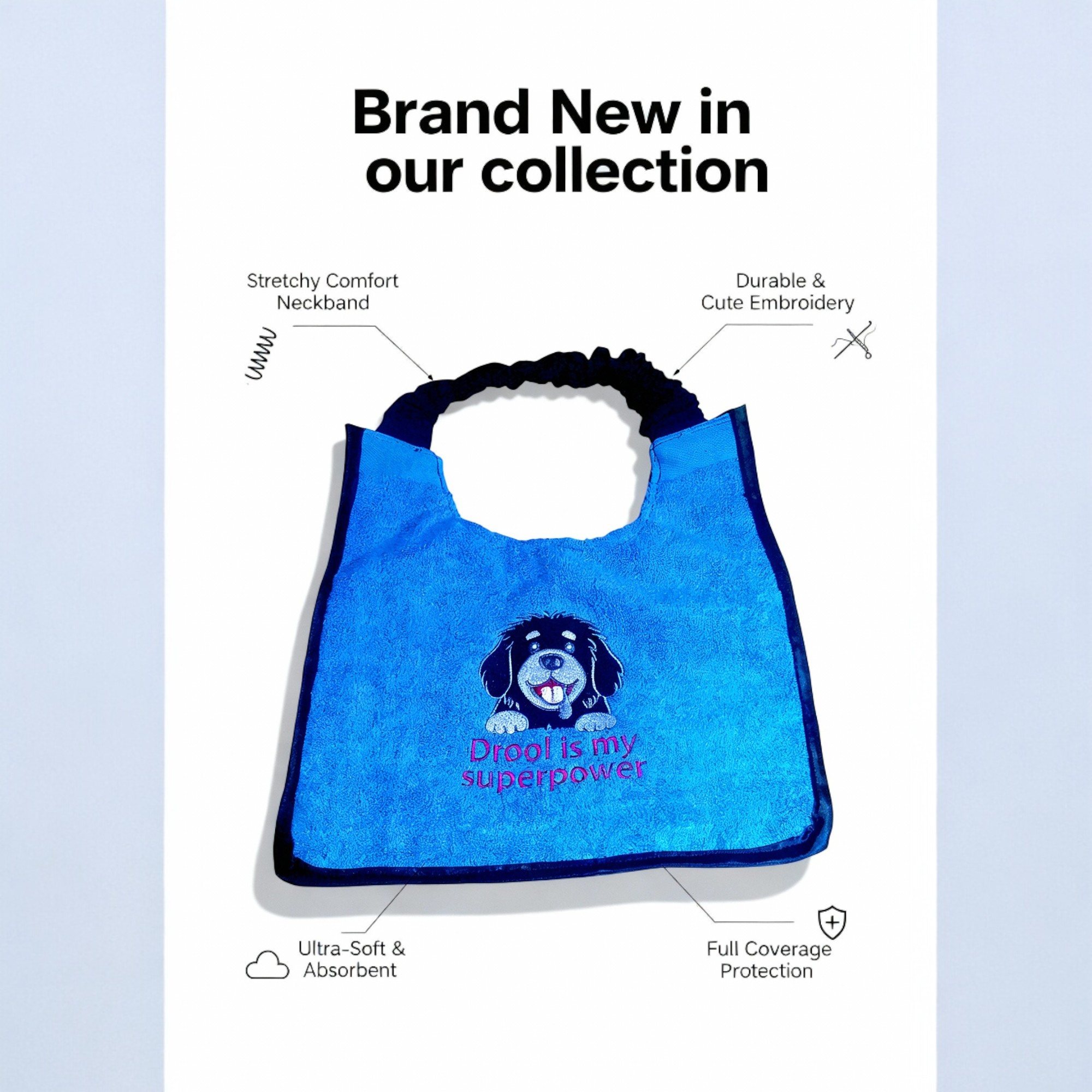 • Drool proudly with DoggiesWorld’s “Drool Is My Superpower” Dog Bib!